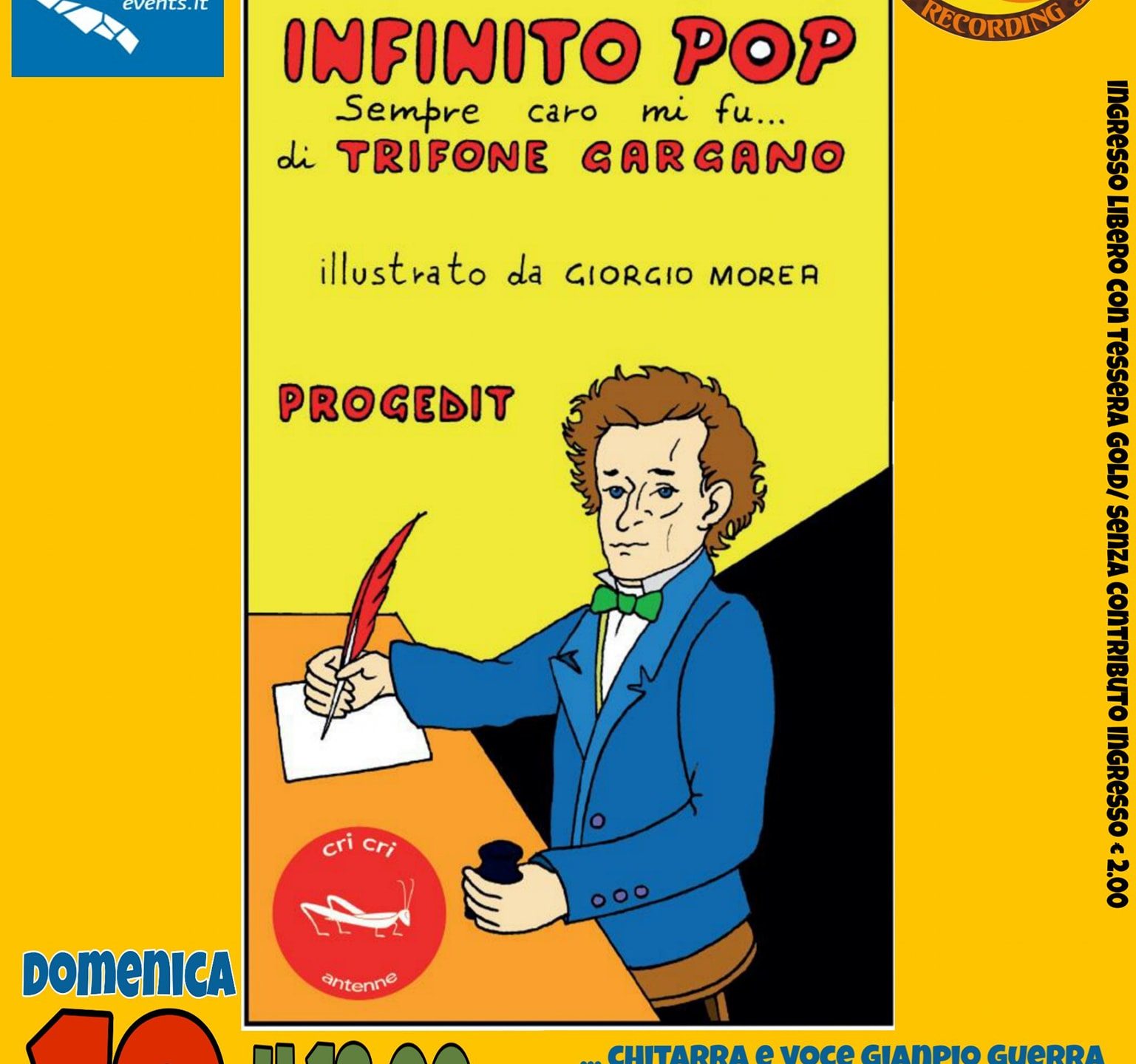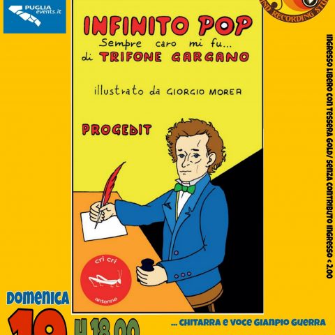 Domenica 19 Gennaio secondo appuntamento del 2020 della rassegna “Domeniche Culturali”, incontri Culturali con autori e artisti, locali e non organizzati dalla nostra Associazione socioculturale “La Traccia Nascosta A.P.S.”. Alle ore 18,00, presso la nostra sede, sarà presentato, a duecento anni dalla composizione del’ Infinito di Giacomo Leopardi, “Infinito Pop. Sempre caro mi fu…” scritto dal Prof. Trifone Gargano che tornerà a trovarci dopo l’entusiasmante ed interessante presentazione “Dante Pop Canzoni e cantautori”.