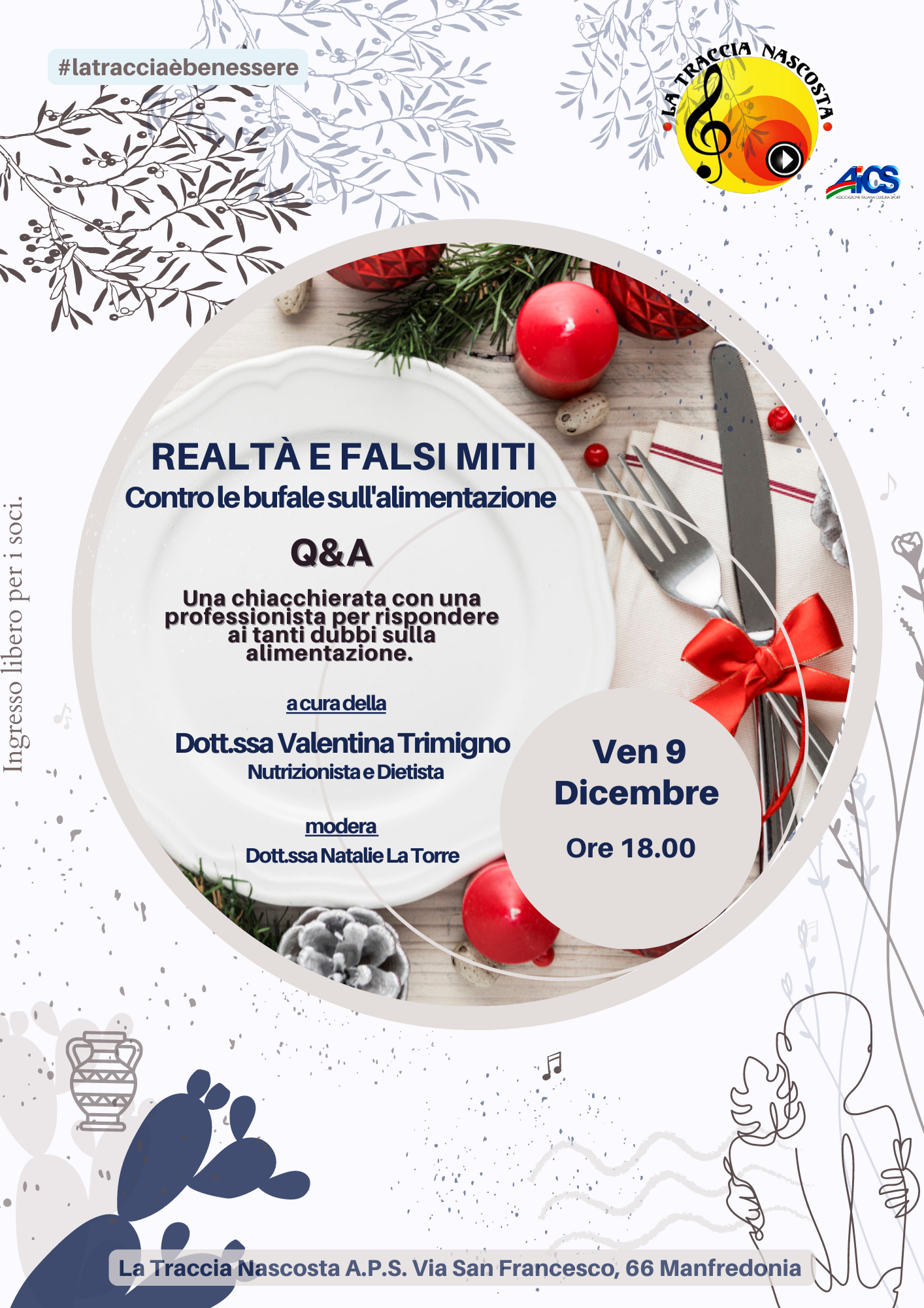 Riprendono le attività socio-culturali de La Traccia Nascosta A.P.S. con l’evento del 9 Dicembre 2022 “REALTÀ E FALSI MITI, CONTRO LE BUFALE SULL’ALIMENTAZIONE”. L’evento, curato in collaborazione con la dott.ssa Valentina Trimigno ricercatrice della nutrizione e dietista, è il primo di un filone legato al benessere e al rapporto sano con il cibo e il proprio corpo.